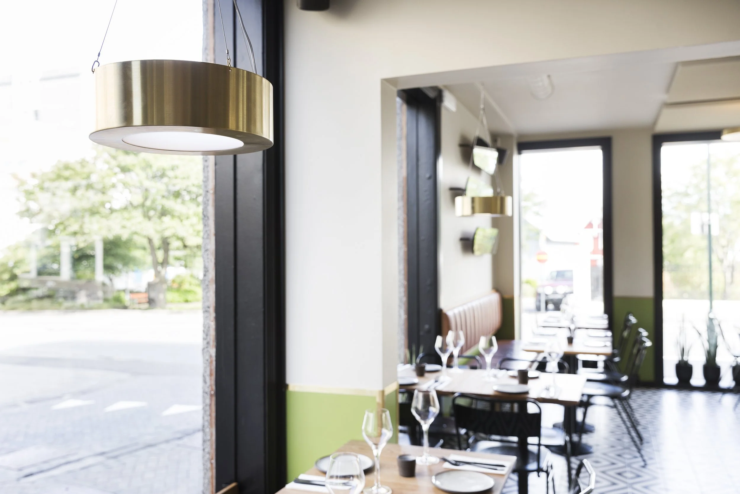 Interior of a restaurant with modern decor, set tables with wine glasses and plates, large windows letting in natural light, and a hanging gold-colored light fixture.