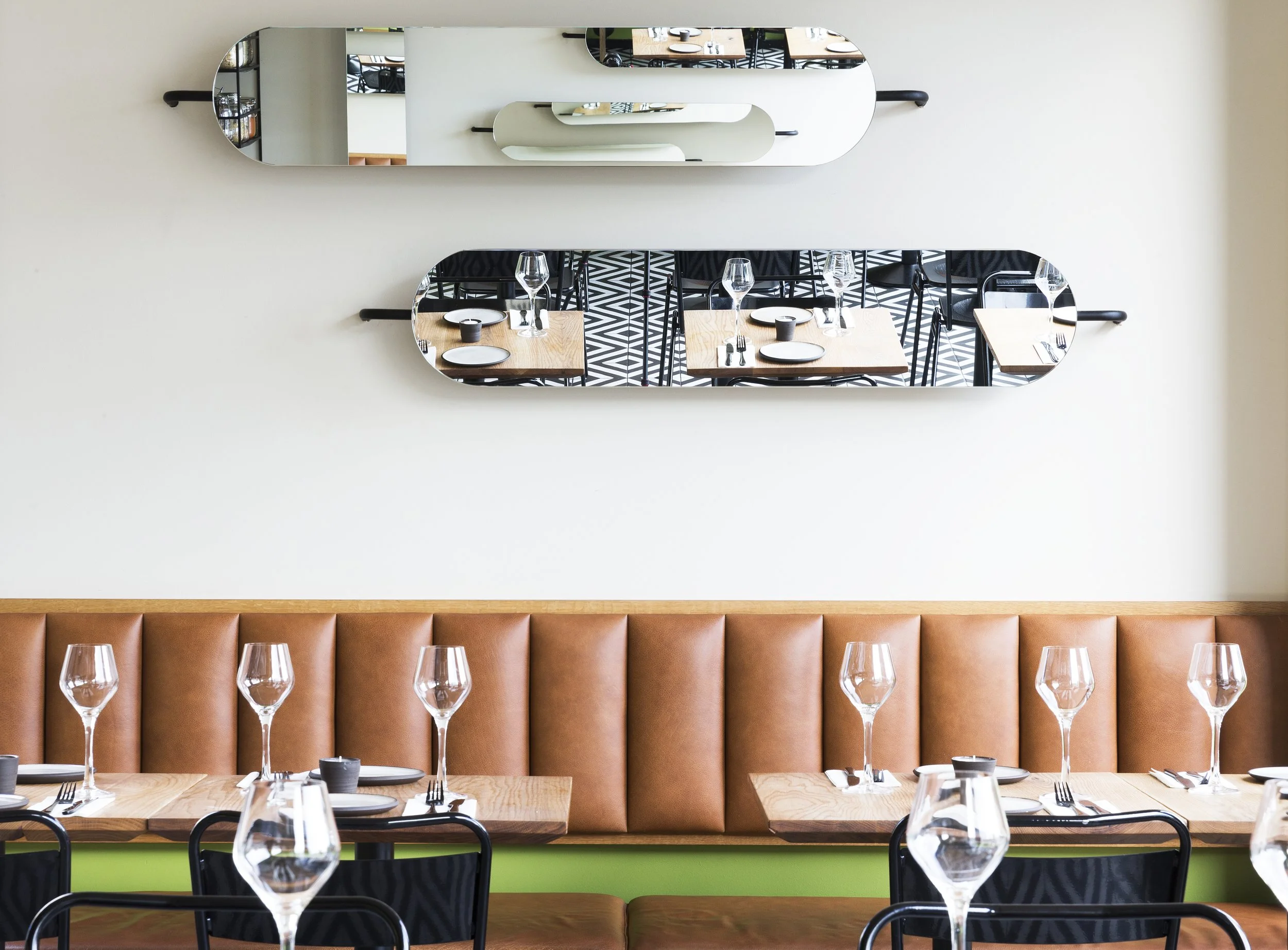 A restaurant table with two wine glasses, a small candle, a plate, a fork and knife on a napkin, set against a green banquette with a brown padded backrest. Above, ceiling mirror and modern circular light fixtures are visible.