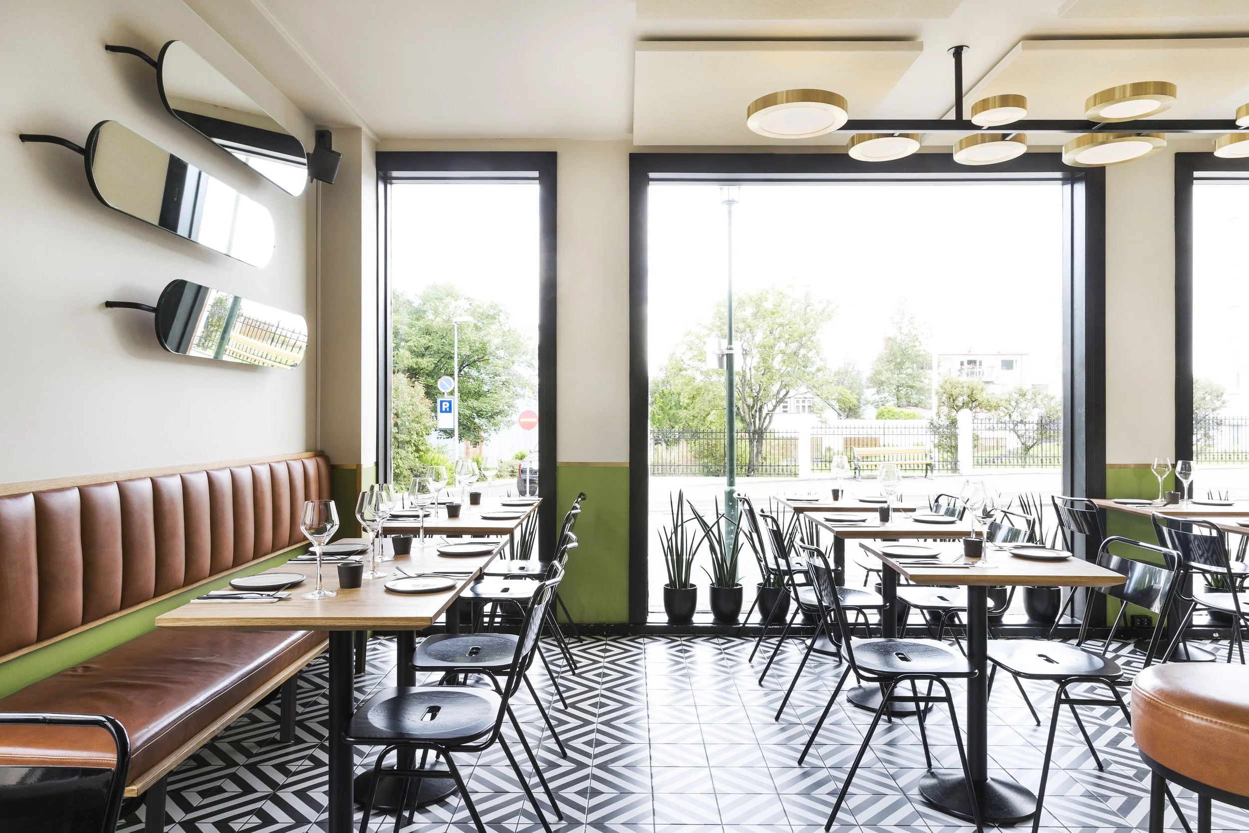 Interior of a modern restaurant with large glass windows, black and white geometric floor tiles, brown leather bench seating, and black chairs around wooden tables set with wine glasses and cutlery.